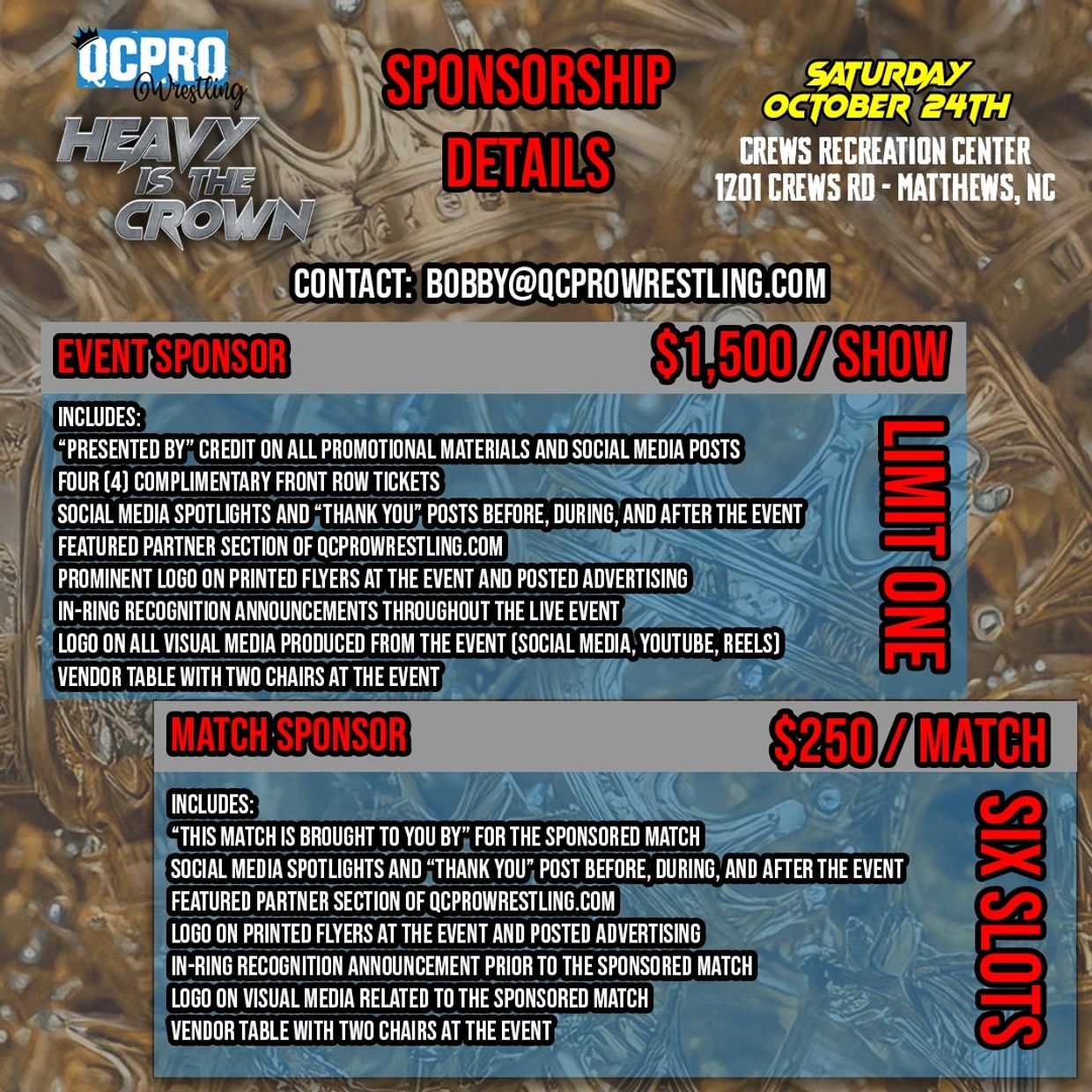 On October 24, 2026 in the Crews Recreation Center, QCPro delivers the first live pro wrestling event in its history! Be a part of the rise of Charlotte's newest pro wrestling promotion by sponsoring part of this event.